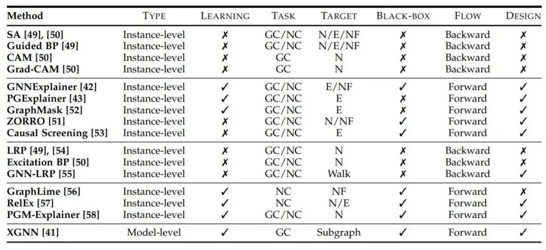 "Type "表示提供什么类型的解释,"Learning "表示是否涉及学习过程,"Task "表示每种方法可以应用于什么任务(GC表示图分类,NC表示节点分类),"Target "表示解释的对象(N表示节点,E表示边,NF表示节点特征,Walk表示图游走),"Black-box "表示在解释阶段是否将训练好的GNNs作为黑盒处理,"Flow "表示解释的计算流程,"Design "表示解释方法是否有针对图数据的具体设计。