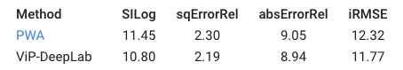 在KITTI深度预测基准上进行单眼深度估计的比较,对于深度估算指标,值越小,性能越好。尽管差异可能看起来很小,但在此基准上性能最高的方法通常在SILog中的间隙小于0.1。