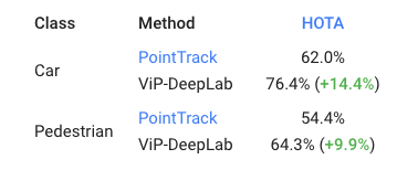 此外,VIP-DeepLab也在KITTI MOTS行人和汽车排名度量使用新的度量标准HOTA,都取得了显著提升。