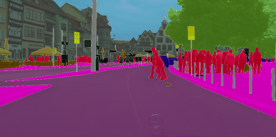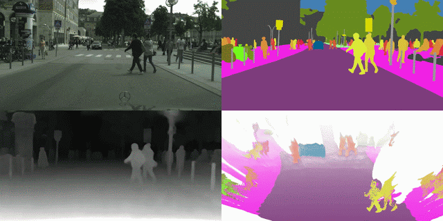 ViP-DeepLab的输出可以用于视频全景分割。连接两个连续的帧作为输入。语义分割输出将每个像素与其语义类别相关联,而实例分割输出则从与第一帧中的单个对象相关联的两个帧中识别像素,输入图像来自Cityscapes数据集。