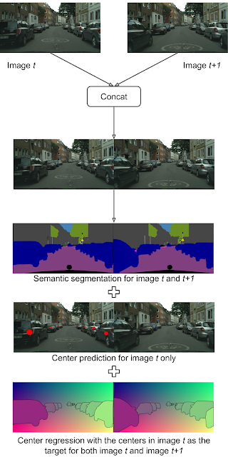 此外,ViP-DeepLab还对出现在第一帧中的对象中心执行两个连续帧的中心回归,此过程称为中心偏移预测,它允许两个帧中的所有像素分组到出现在第一帧中的同一对象。如果未将新实例匹配到先前检测到的实例中,则会出现新实例。