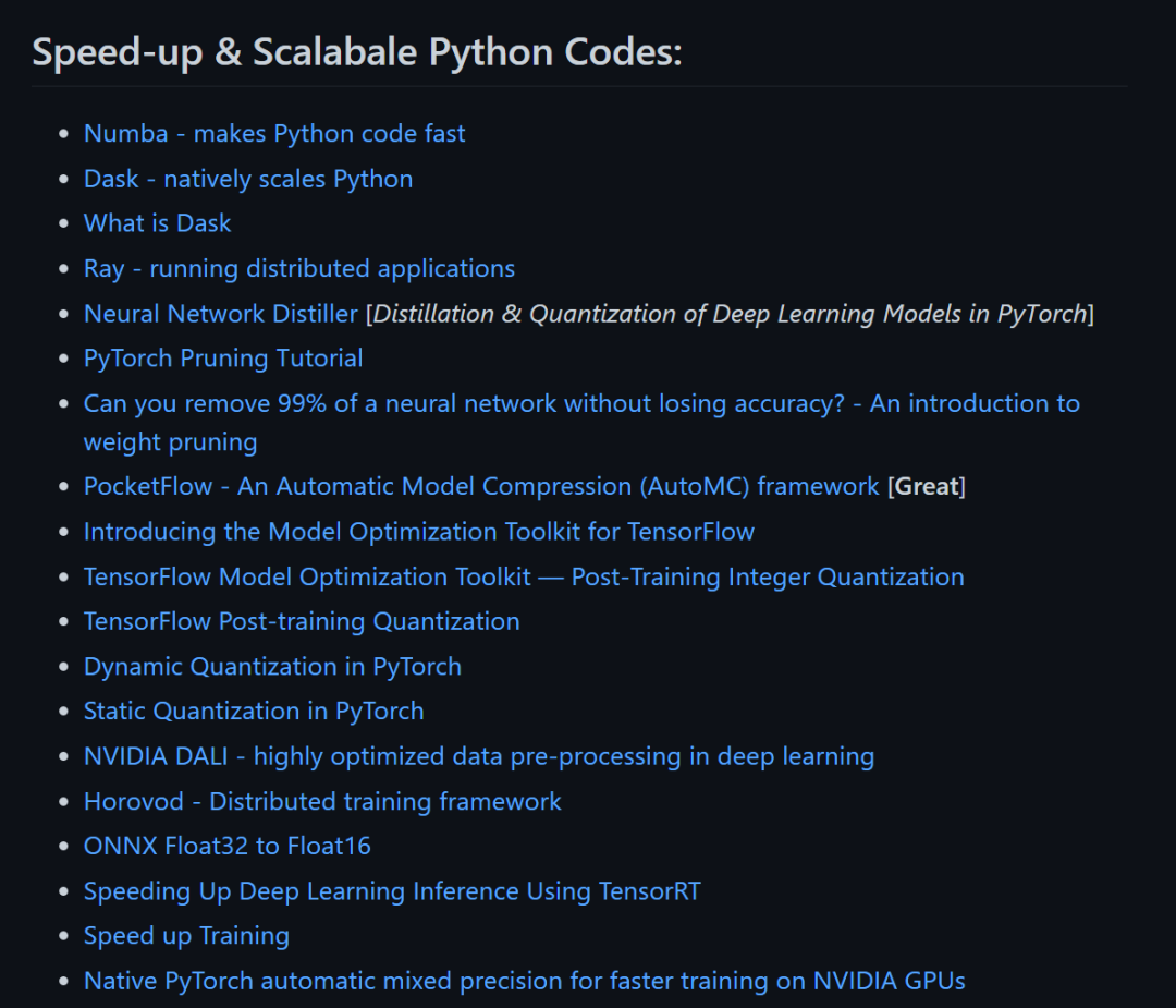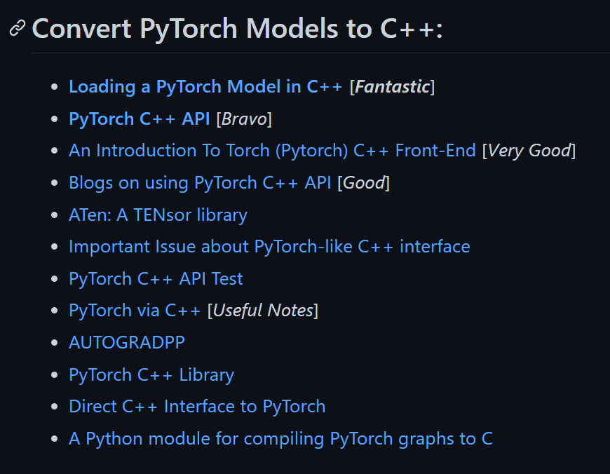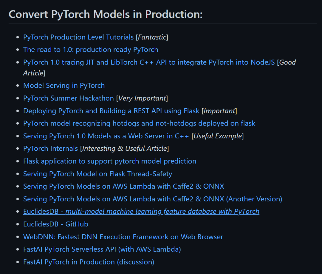 仓库作者ahkarami为大家整理和提供了大量模型部署的学习资料和相关链接。主要包括生产环境下PyTorch模型转换、PyTorch模型转为C++模型、生产环境下TensorFlow模型转换、生产环境下Keras模型转换、生产环境下MXNet模型转换、基于Go语言的机器学习模型部署、通用深度学习模型部署工具箱、前端UI设计资源、移动端和嵌入式模型部署、后端开发部分、基于Python的代码优化和加速等。