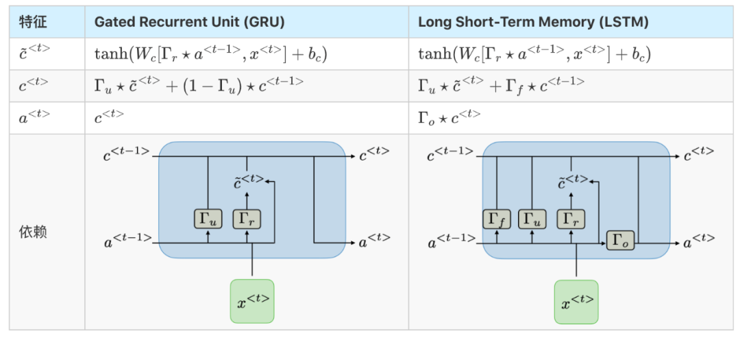 Gated Recurrent Unit(GRU)和长-短期记忆单元(LSTM)处理传统RNNs遇到的消失梯度问题,LSTM是GRU的推广。下表总结了每种结构的特征方程: