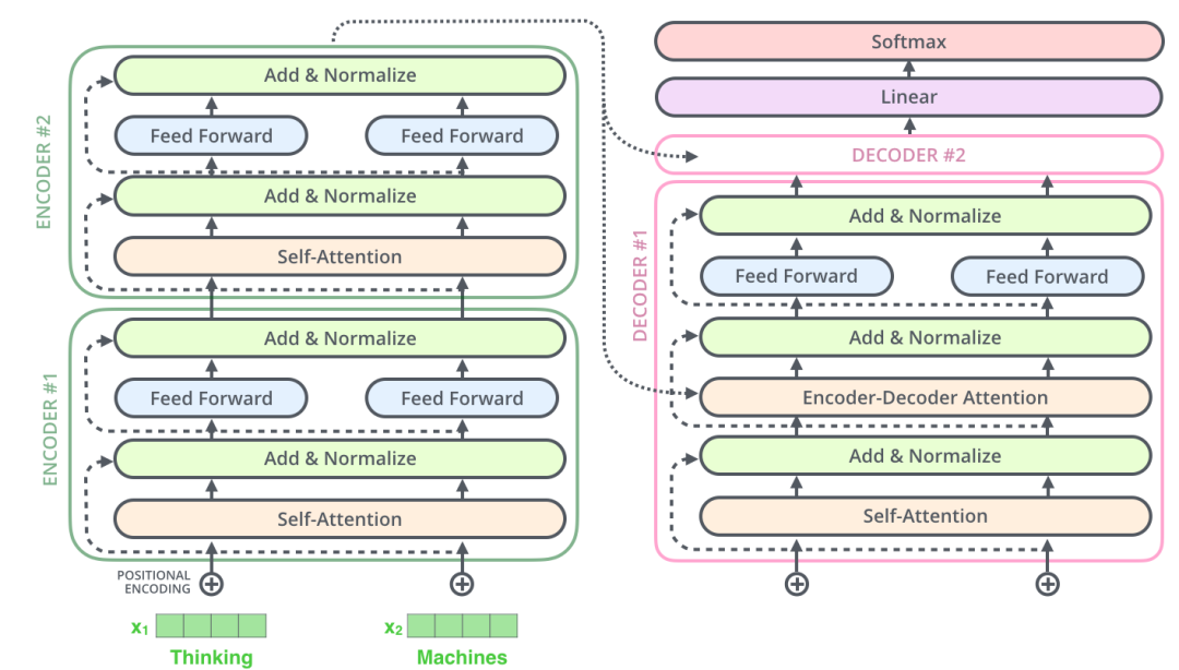在图figure 1中,还有一个向量positional encoding,它是为了解释输入序列中单词顺序而存在的,维度和embedding的维度一致。这个向量决定了当前词的位置,或者说是在一个句子中不同的词之间的距离。论文中的计算方法如下: