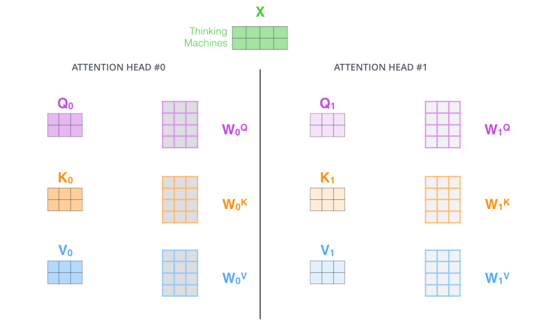 多头注意力机制是指有多组Q,K,V矩阵,一组Q,K,V矩阵代表一次注意力机制的运算,transformer使用了8组,所以最终得到了8个矩阵,将这8个矩阵拼接起来后再乘以一个参数矩阵WO,即可得出最终的多注意力层的输出。全部过程如下图所示: