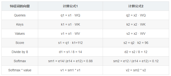 图中,WQ,WV,WK是三个随机初始化的矩阵,每个特征词的向量计算公式如下所示: