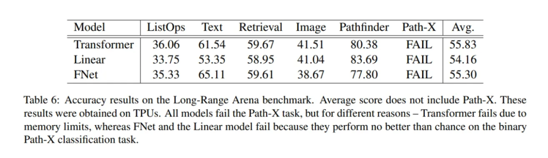 FNet 在「Long Range Arena」基准评估中,与所有的高效 transformer 具有竞争力,同时在所有序列长度上拥有更少的内存占用。