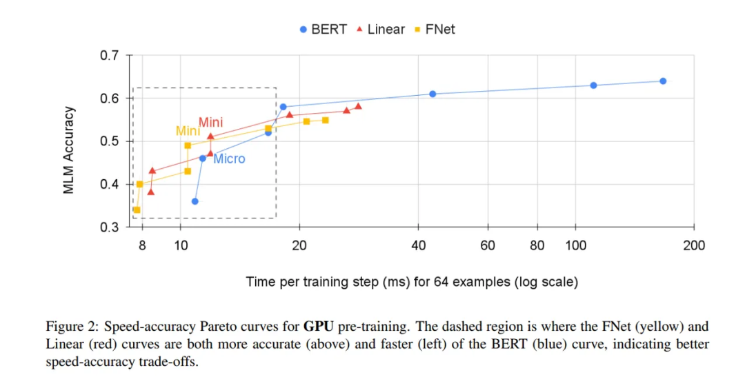 仅包含两个自注意子层的 FNet 混合模型在 GLUE 基准上可达到 97%的 BERT 准确率,但在 GPU 上的训练速度快近 6 倍,而在 TPU 上则是 2 倍。