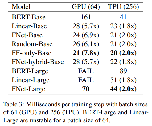 由下表 3 可得,尽管线性模型和 FNet 训练的精确率略低,但它们明显快于 BERT——在 TPU 上大约快 2 倍,在 GPU 上大约快 7 倍。
