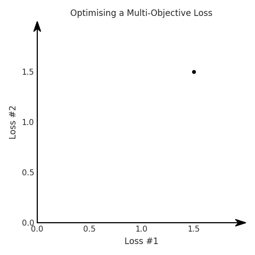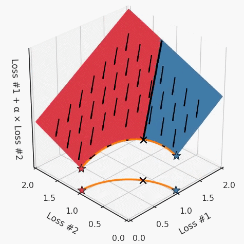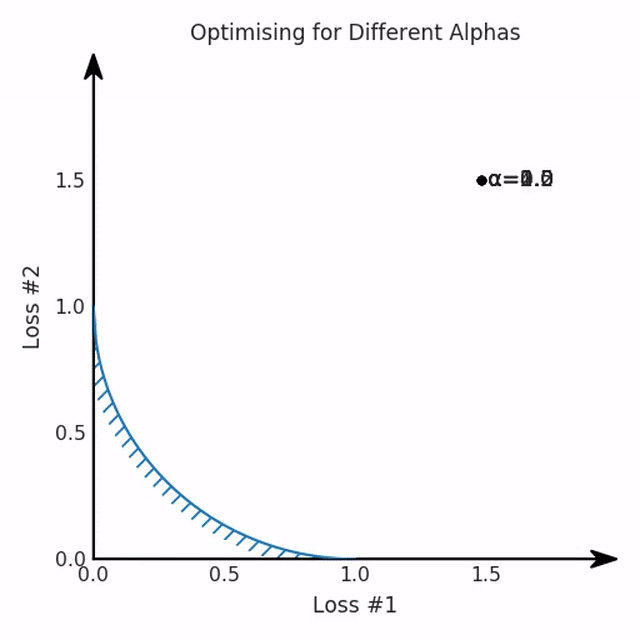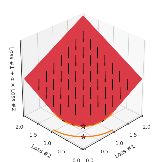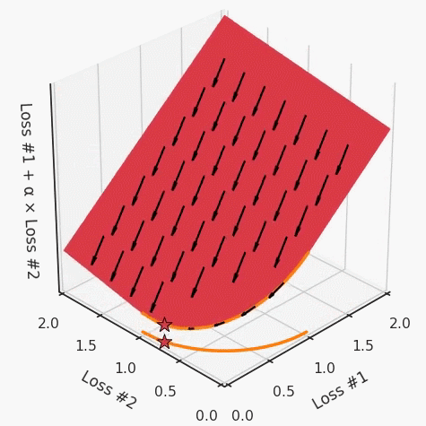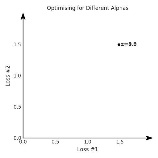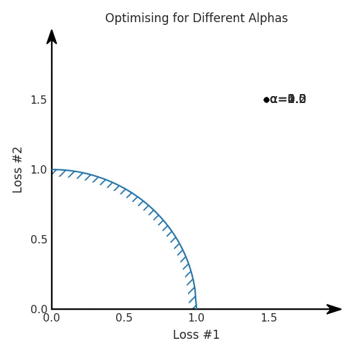 我们希望看到:当调整 α 时,可以选择两个损失之间的折衷,并选择最适合自身应用的点。我们将有效地进行一个超参数调整回路,手动选择一个α来运行优化过程,决定降低第二个损失,并相应地调整α并重复整个优化过程。经过几次迭代,我们满足于找到的解,并继续写论文。