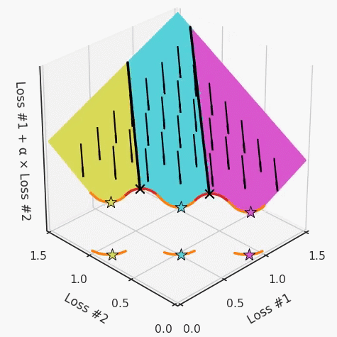 以一个帕累托前沿面为例,凸块之间有凹块。每个凹块不仅可以确保无法通过梯度下降找到解,还可以将参数初始化的空间分成两部分,一部分可以在一侧的凸块上找到解,而另一部分智能在另一侧上找到解。如下动图所示,在帕累托前沿面上有多个凹块会使问题更加复杂。