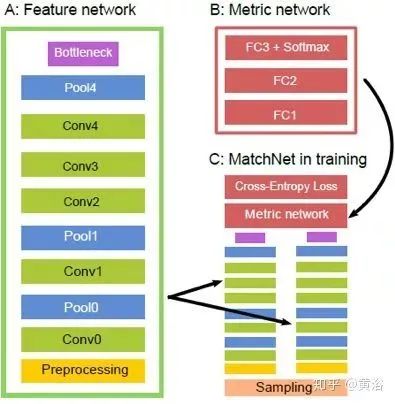 如图是MatchNet训练时的网络架构(图C),联合学习将补丁映射到特征表示的特征网络(图 A)和将特征对映射到相似性的测度网络(图 B)。输出尺寸由(高×宽×深)给出。PS是卷积和池化层的补丁大小; S是步幅。层类型:C=卷积,MP=最大池化,FC=全连接。因为填充卷积层和池化层,故输出高度和宽度是输入除以步幅的值。对FC层,大小B,F选自:B∈{64,128,256,512},F∈{128,256,512,1024}。除FC3外,所有卷积层和FC层用ReLU激活,输出用Softmax归一化。