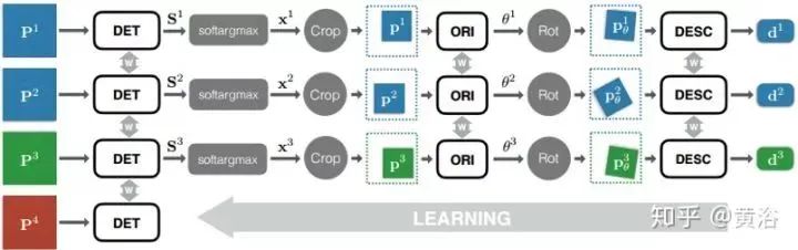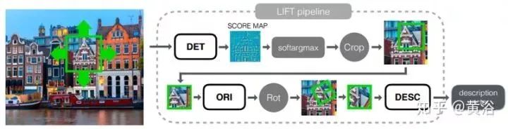 LIFT是一种深度网络架构,实现了完整的特征点检测、朝向估计和特征描述,如图所示。