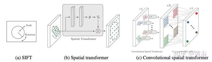 如图比较卷积空间变换器和其他方法的比较:(a)SIFT标准化旋转和缩放;(b)空间变换器将整个图像作为输入来估计变换;(c)卷积空间变换器对特征进行独立变换。