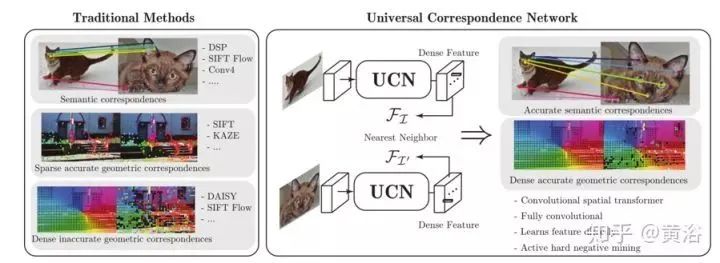 如图是UCN和传统方法的比较:各种类型的视觉对应问题需要不同的方法,例如用于稀疏结构的SIFT或SURF,用于密集匹配的DAISY或DSP,用于语义匹配的SIFT flow或FlowWeb。UCN准确有效地学习几何对应、致密轨迹或语义对应的度量空间。