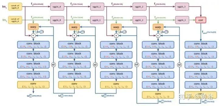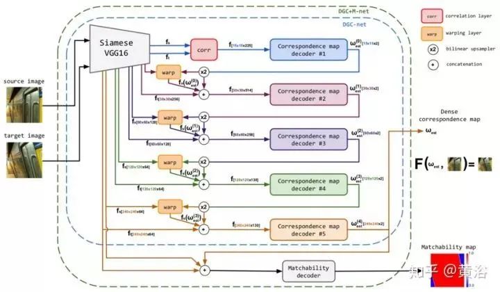 DGC-Net(Dense Geometric Correspondence Network)【5】是一种基于CNN实现从粗到细致密像素对应图(pixel correspondence map)的框架,它利用光流法的优势,并扩展到大变换,提供密集和亚像素精确的估计。训练数据来自合成的变换,也应用于相机姿态估计的问题。