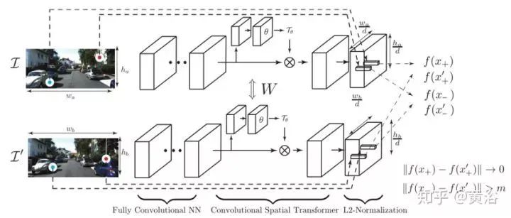 下图是UCN系统概述:网络是全卷积的,由一系列卷积、池化、非线性和卷积空间变换器组成,还有通道L2归一化和对应对比损失函数。作为输入,网络采用图像对应点的一对图像和坐标(蓝色:正,红色:负)。对应于正样本点(来自两个图像)的特征被训练为彼此更接近,而对应于负样本点的特征被训练为相隔一定距离。在最后L2归一化之前和FCNN之后,设置一个卷积空间变换器来归一化补丁或考虑更大的上下文信息。