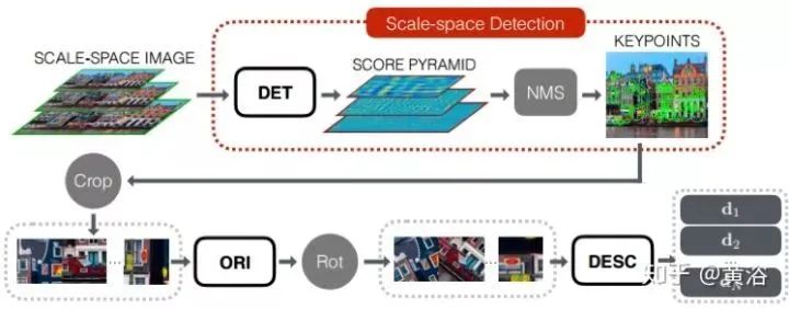 最后的运行结构如图所示。由于朝向估计器和描述子只在局部最大值进行评估,将检测器解耦并在传统NMS的尺度空间中运行,以获得其他两个组件的建议。