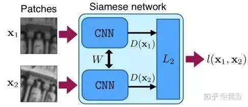 如图所示,用一个Siamese网络来学习这样的描述符,其中非线性映射由CNN表示,它对对应或非对应补丁对优化。补丁通过模型提取描述符然后计算其L2范数,作为图像描述符的标准相似性度量。而目标是学习一个描述符,在其空间中让非对应的补丁相隔甚远,而在对应的补丁紧密相连。