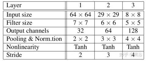 这里下表给出的是三层网络架构:64×64输入在第3层中产生128维输出。每个卷积层由四个子层组成:滤波器层,非线性层,池化层和归一化层。