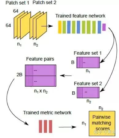 下图是MatchNet预测的流水线图,网络拆解为并行的特征网络和测度网络。分两个阶段使用特征网络和测度网络:首先为所有补丁生成特征编码,然后将这些特征配对并推送它们通过测度网络获得分数。
