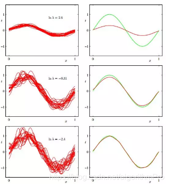 如上图所示,左图表示100组数据集的拟合情况,可评估模型的方差。右图是对左图100组数据集每点求平均后的数据拟合情况,绿线表示理论模型,红线表示数据集平均后的结果,可评估模型的偏差。