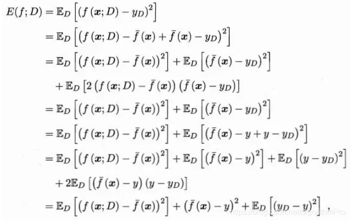 测试集的期望泛化误差是评价模型泛化性能的金标准,已知训练数据集D的概率分布,对测试样本x,令yD为x在数据集中的标记,y为x的真实标记,f(x;D)为训练集D上学得模型f在x上的预测输出,不同的训练集D构建不同的最优模型f。