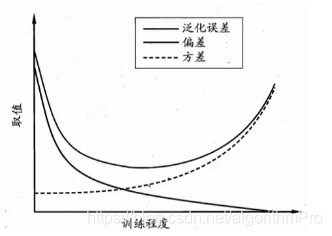偏差与方差是一对矛盾的量,称偏差-方差窘境(bias –variance dilemma)。当学习模型的训练程度低时,学习器的拟合能力不强,模型处于高偏差状态,训练数据集的扰动不足以使学习器发生显著变化,模型具有低方差属性;当模型训练程度高时,模型复杂度高,处于低偏差状态,训练数据集的扰动使学习器发生了显著变化,模型具有高方差属性。