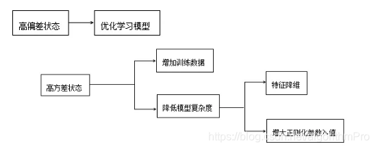 我们在设计学习模型时需要对该模型有一个清晰的思路,若当前学习模型处于高偏差状态,则需要优化学习模型,增加训练数据并不能优化模型;若当前学习模型处于高方差状态,不同的训练数据集构建的模型有比较大的差异,需要增加训练数据或降低模型的复杂度(如下图)。