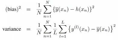 我们处理的数据都是随机抽样的样本数据,期望是均值的无估计偏差,若对采样的数据进行分组,可以估计模型的偏差与方差。抽样数据集共分为L组,每组抽样数据集包含N个采样点,由上节的偏差与方差公式,可推算偏差与方差的公式如下: