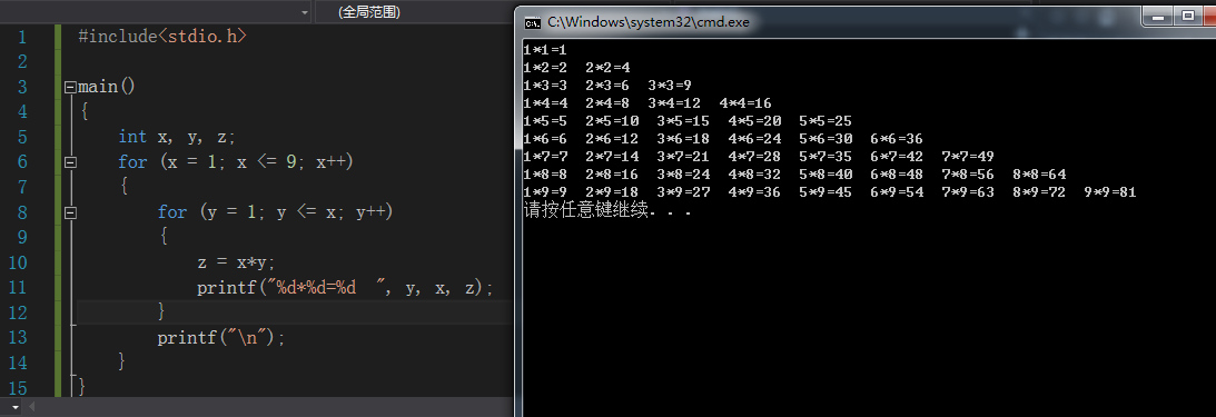 #include<stdio.h> main() { int x, y, z; for (x = 1; x <= 9; x++) { for (y = 1; y <= x; y++) { z = x*y; printf("%d*%d=%d ", y, x, z); } printf("\n"); } }