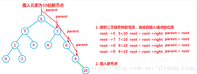 (2.)树不为空时,按二叉搜索树的性质查找插入位置,插入新节点。