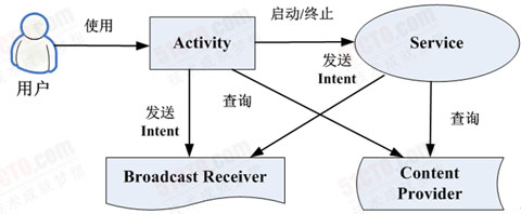 (2) 应用主要由四大组件构成,分别是Activitiy、Service、Content Provider、Broadcast Intent Receiver。应用组件里除了Contentproviders之外都可以用intent对象激活。Activity是Android应用的核心概念,简而言之Activity为用户交互管理者,有一个可视界面呈现,而Service跟Activity的区别是他在后台运行,没有界面呈现。而Intent的意义是意图,他在Android的概念空间中代表消息,这个消息代表了请求的意图。