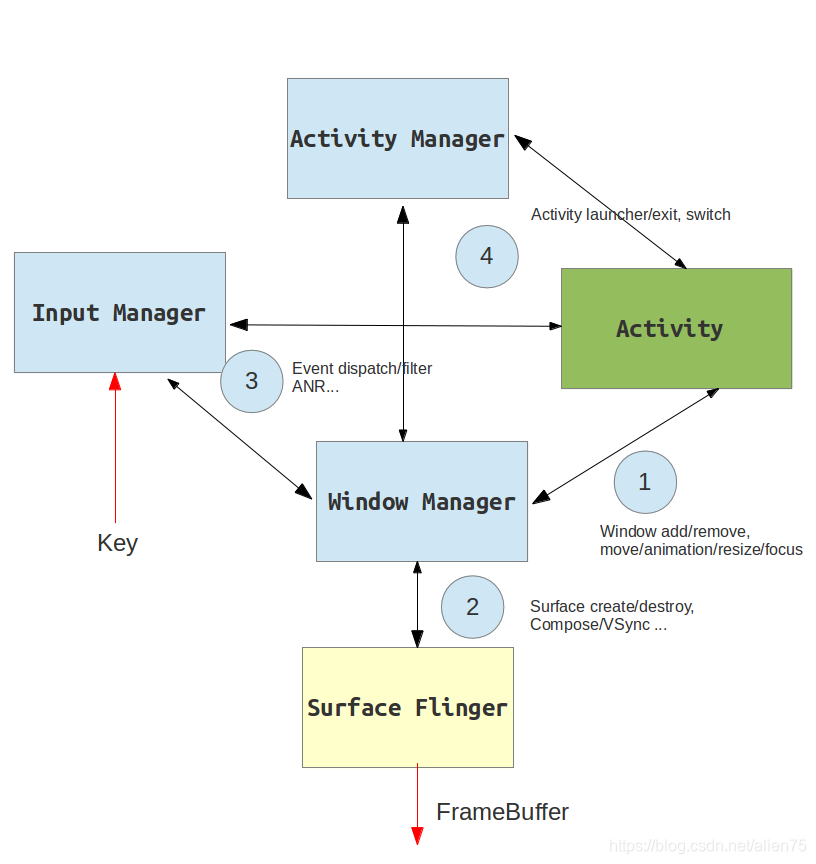 这个缩略词其实最早是在做WINCE的时候遇到的,GWES的意思是“图形(Graphic)窗口(Window)事件(Event)系统”,Android做为移动终端设备系统,GWES也具备普世价值(否则要它何用)。各部分所承担的工作职责从抽象上大体是: