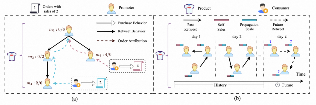 其中 代表着订单, 代表着推广者 直接或间接参与促成的订单集合。对于任意一个订单 ,其对应的销量 。为了更清晰地阐述该定义,我们以图1(a)中的一个具体案例进行说明:
