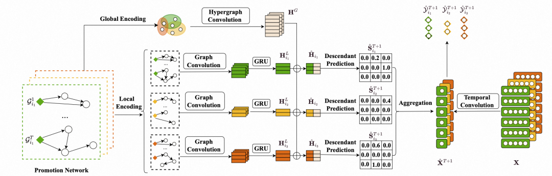 结构预测通路:预测未来的推广网络。针对推广高度动态这一难点(对应难点二),我们不预测完整的推广图,而是简化为预测节点间的后代关系。为此,我们设计了“局部+全局”的双重编码器来学习推广者的动态表征:
