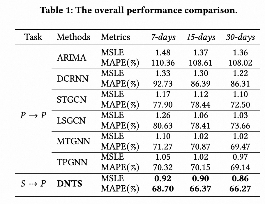 从表一的实验结果中,我们可以看到:DNTS取得了全方位的性能领先:在所有三个数据集上,DNTS的核心指标均显著优于所有基线模型。相较于表现最好的基线TPGNN,DNTS在30-days数据集上取得了11.3%的MSLE相对提升和4.1%的MAPE相对提升。所有模型在 数据集上的表现普遍优于 ,这符合预期,证明了模型能够有效利用更丰富的历史信息。尽管TPGNN等模型通过引入图自学习、时间多项式等技术不断优化,但它们仍然在传统的“信号-图卷积”端到端范式下运行,面对我们定义的这个新问题时,明显表现乏力,而我们的两阶段预测方法能更好的处理层级预测任务。