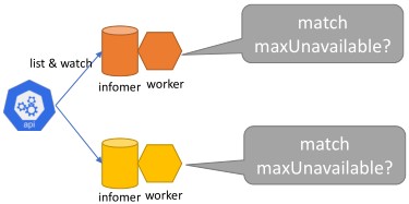 但是如果 Pod 有多个 Owner,比如 CloneSet 是其中一个 Owner,CloneSet 对上面的 Pod 开始做原地升级,SidecarSet 对第二个 Pod 做 sidecar 的原地升级,那么同一时刻可能这个应用的两个 Pod 都在被升级。因为在 CloneSet 定义了 Max Unavailable 是 50%,从它的视角来看,只要选取两个 Pod 中的一个开始做升级。CloneSet 本身是无法感知到其它控制器甚至其他人为的行为去对其它 Pod 做操作,缺乏全局视角,每一个控制器都认为自己在升级的 Pod 是符合升级策略,符合最大不可用测略。但当多个控制器同时开始工作的时候,可能会导致整个应用 100% 不可用。