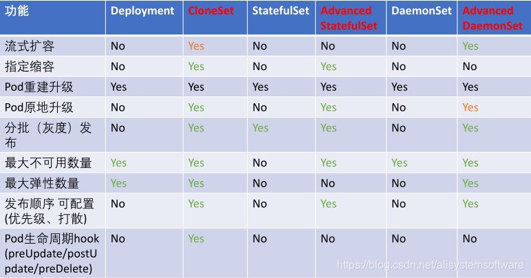 那么,对于这场景而言,Kruise 已经做了比较完备的一个无状态以及有状态应用的部署,通过上图表格能看到 Kruise 提供的 workload 和原生 deployment、StatefulSet、DaemonSet 的对比。