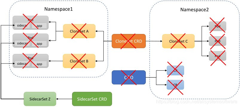 如果 CRD 是 CloneSet 这种 Workload 级别的 CRD,那么一旦删除这个 CRD 之后,会导致所有 CRD 底下的 CloneSet 的 CR 对象全部被删掉,从而导致所有的业务 Pod 全部被删掉。也就是说,删除一个 Workload,只是这个 Workload 底下的 Pod 被删掉;删除一个 Namespace 可能只是 Namespace 底下的 Pod 被删掉。但如果像阿里巴巴这种场景下,如果有人把 CloneSet 或者一些很关键的 CRD 删掉的话 ,其实很可能导致整个集群环境所有 NameSpace 底下的 Pod 都会被级联删掉,或者说都会处于应用不可用的状态,造成云原生环境对于应用可用性的风险。如下图所示: