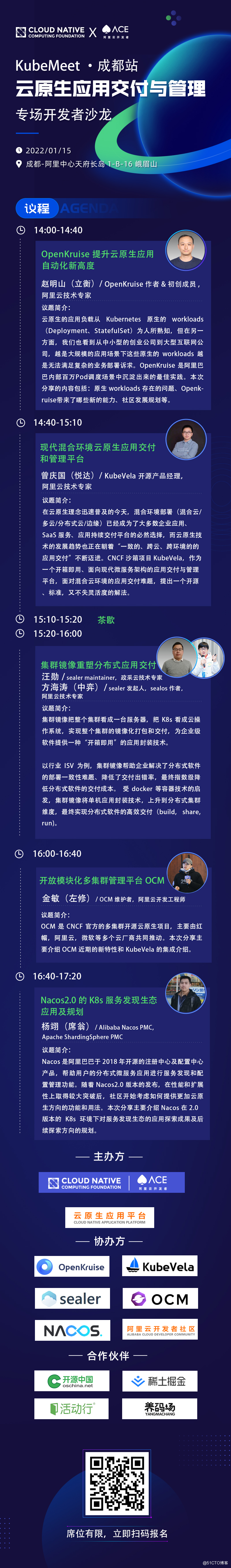 “九天开出一成都,万户千门入画图” KubeMeet 开发者沙龙新年首站 “锁定” 成都,本场沙龙将以「云原生应用交付与管理」为主题,结合云原生应用交付、自动化部署、跨集群管理等环节中的落地挑战,分享 KubeVela、OpenKruise、OCM、Sealer、Nacos 等开源技术的应对思路和企业级应用实践。