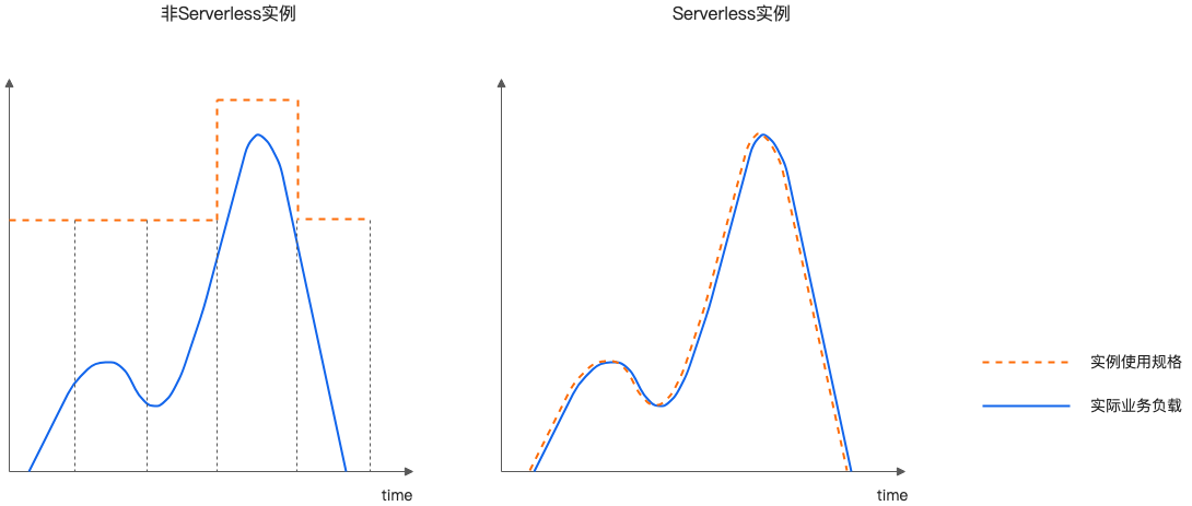 在业务波动较大的场景下,非 Serverless 实例(包年包月和按量付费)和 Serverless 实例使用规格的变化情况如下图所示: