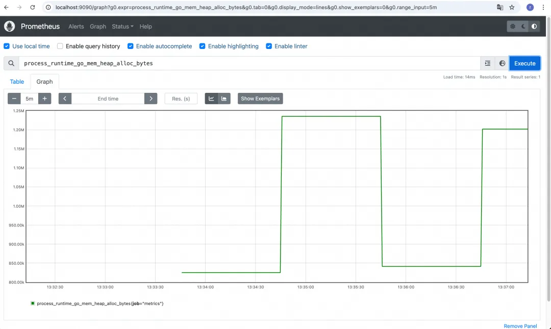 最后,访问 http://localhost:9090,在 prometheus 中搜索相关指标信息,可以发现相关指标已正常生成并上报,通过以上指标可以更好地帮助用户了解 Golang 运行时的相关信息以及 HTTP 总体的调用状况。