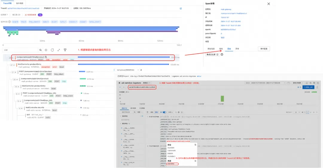 1. 链路与日志双向关联跳转: 排查系统报错时,可以从微服务调用视角找到错误调用链,再查看关联的应用日志。而排查业务报错时,可以先检索应用日志里的业务关键词,再通过日志关联的 TraceId 反向查询上下游信息。