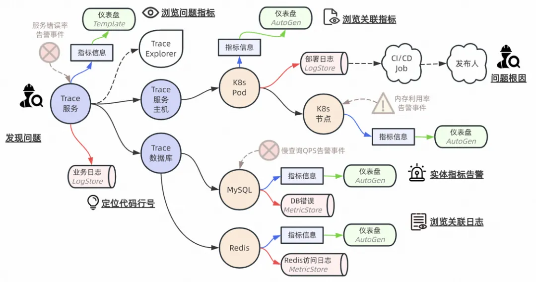 无论是“错”问题,还是“慢”问题。从研发运维视角,都希望能够快速止损、定位根因、消除隐患。然而,面对复杂的应用间依赖,如何抽丝剥茧快速定位异常节点,深入分析异常背后的根本原因,并在极短的时间完成定位与恢复动作,每一步都面临巨大的技术挑战。