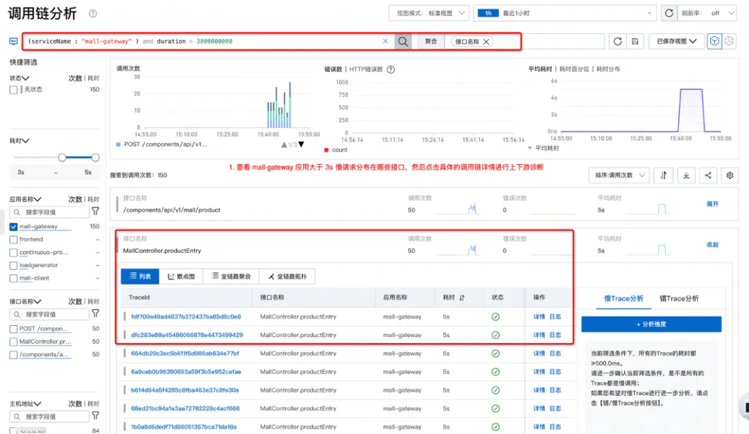 - 根据应用、接口、耗时等参数筛选出满足条件的调用链。查看慢请求分布特征,比如是否集中在某一台机器(疑似单机故障),再展开分析具体的调用链详情。