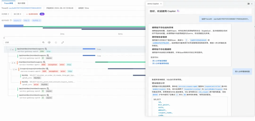 如下图所示,该次请求报错的根因是 service-coupon-apm3 应用 /coupon/coupon/member/list 接口内部的 queryMemberCoupons 方法执行了数据库查询,该 SQL 的 WHERE 子句使用了空集合()作为 IN 操作符,最终导致语法报错。