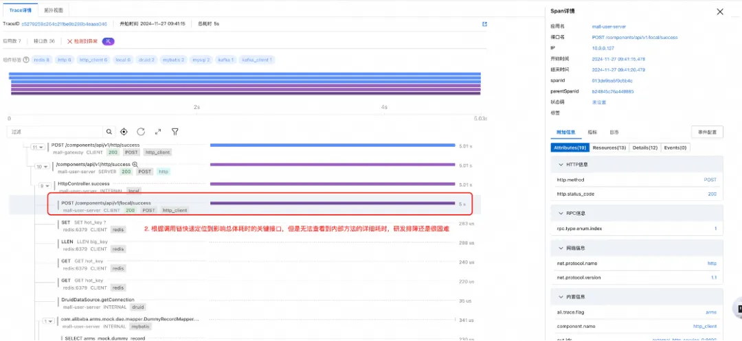 - 根据调用链瀑布图定位到影响总体耗时的关键服务接口,完成问题初步定界。