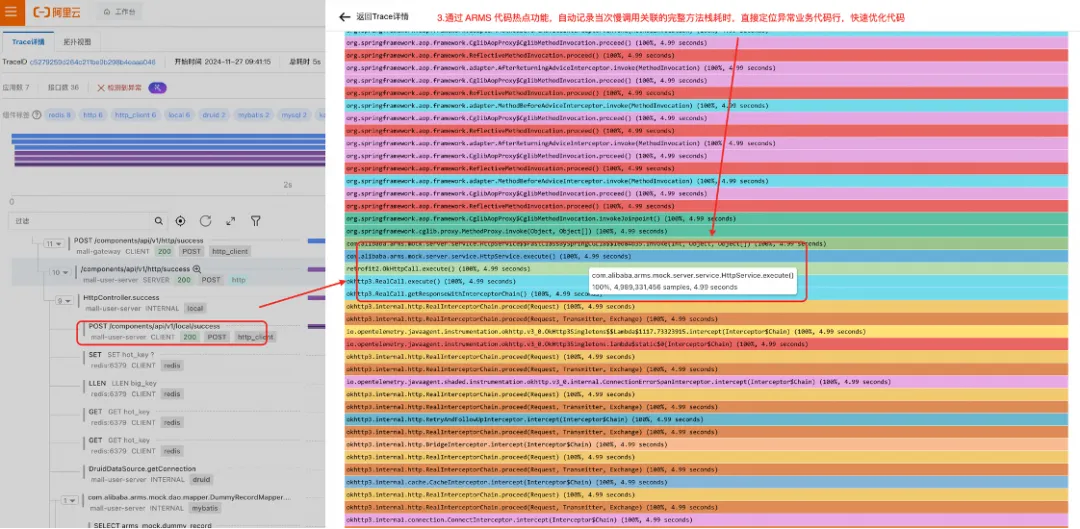 - 根据代码热点记录的当次慢请求关联的完整本地方法栈,直接定位业务异常代码行,指导研发同学优化代码。
