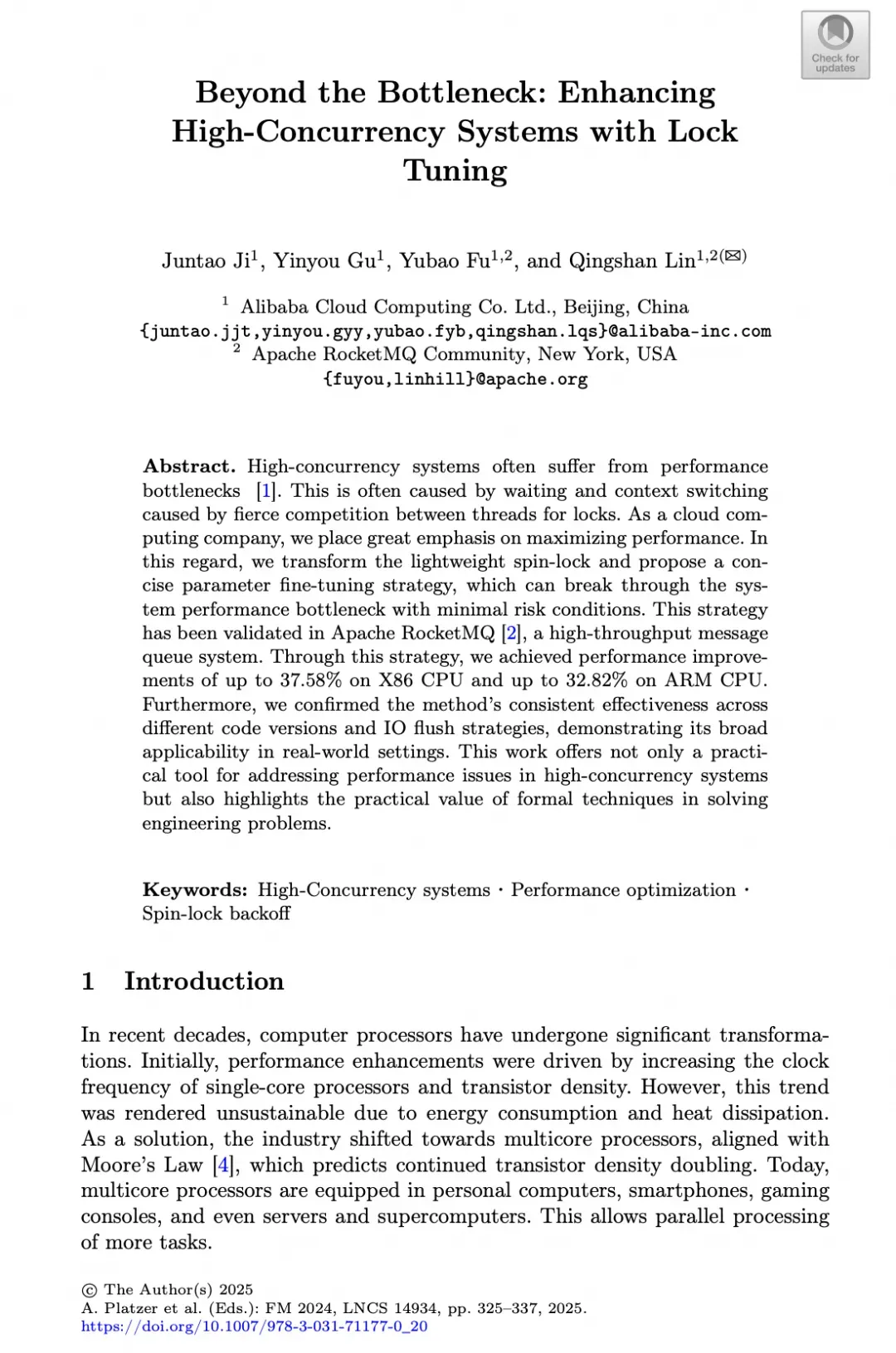 ① 2024 年 9 月,由阿里云消息队列团队发表的关于 RocketMQ 锁性能优化论文《Beyond the Bottleneck: Enhancing High-Concurrency Systems with Lock Tuning》被 CCF-A 类软件工程顶级会议 FM 2024 录用。